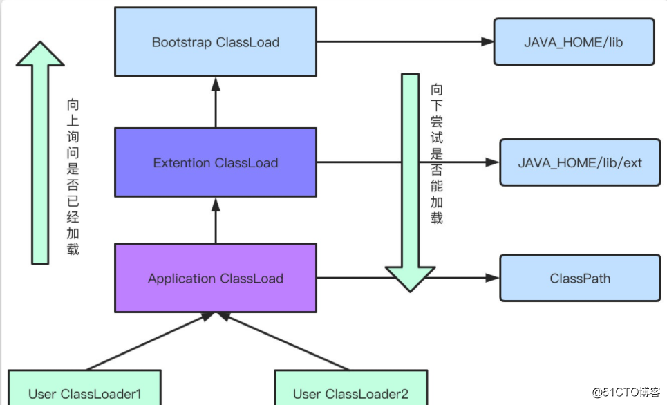 当类加载器收到一个类的加载请求时,它首先不会自己尝试去加载它,而是把这个请求委托给父类加载器去完成,这样层层委派,因此所有的加载请求最终都会传送到顶层的启动类加载器中,只有当父类加载器反馈自己无法完成这个加载请求时,子加载器才会自己尝试去加载。